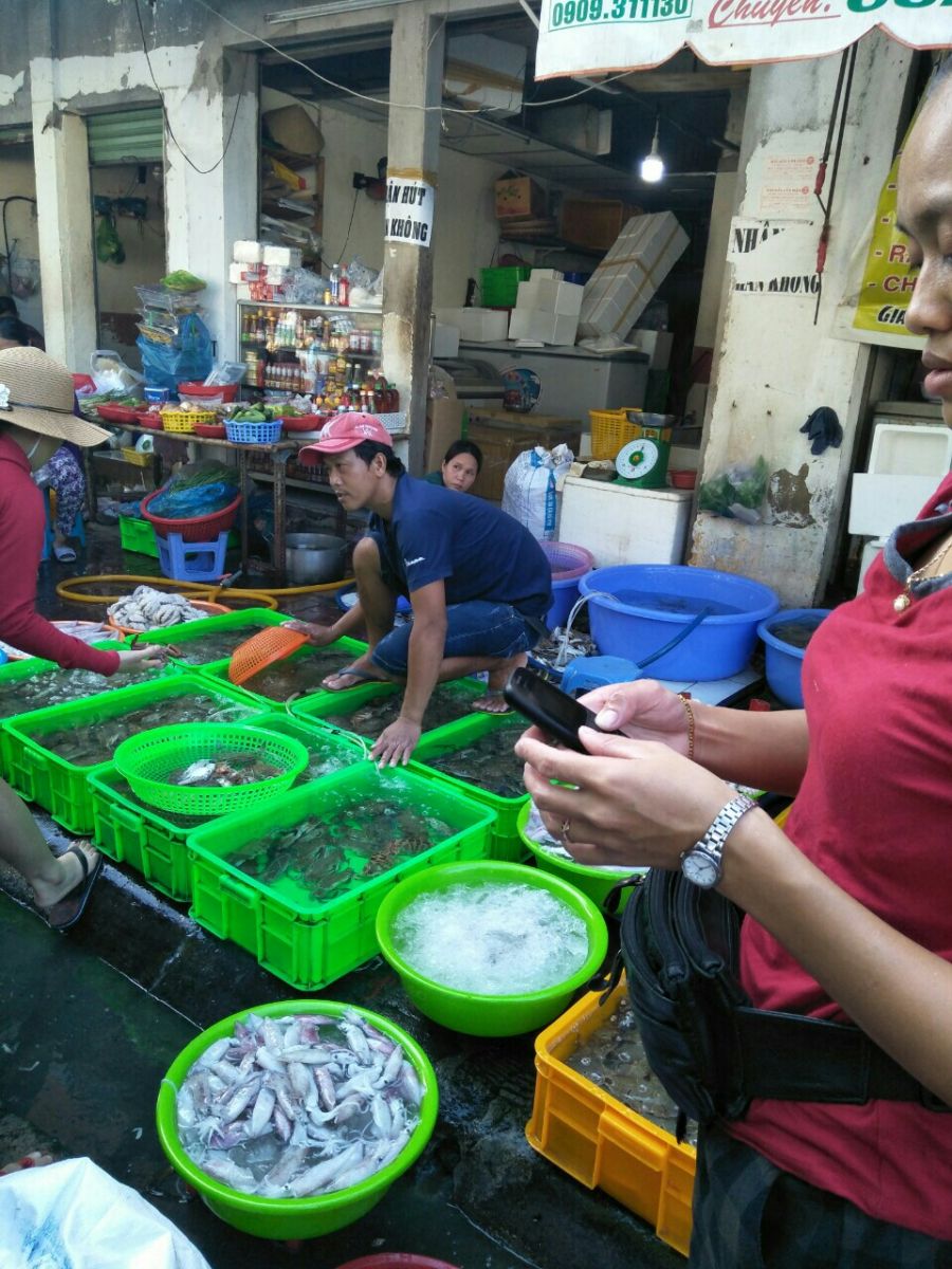 Chiều 16 giờ chúng tôi bắt đầu đi mua hải sản tại Chợ Lưới, những con tôm, con cá, con mực vẫn còn sống, đua nhau nhảy múa trong những thau nước mát lạnh, chúng tôi đã chọn mua một số hải hải, nào tôm, nào cá, nào ốc, … Tất cả chúng tôi nhờ họ chế biến sẵn sàng, nhìn hấp dẫn vô cùng.