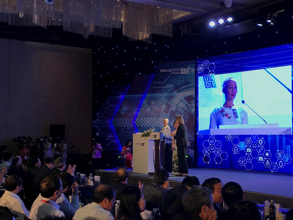 Sáng nay, 13/7/2018, robot Sophia - Quán quân sáng tạo của Tổ chức phát triển Liên hiệp quốc (UNDP), một robot được Ả Rập Xê-út cấp quyền công dân như con người, đã có mặt tại Việt Nam, giao lưu và chia sẻ về một số vấn đề của Cách mạng công nghiệp 4.0. Chương trình này nằm trong khuôn khổ Diễn đàn cấp cao và Triển lãm quốc tế về Công nghiệp 4.0 - Industry 4.0 Summit 2018 chủ đề: “Tầm nhìn và chiến lược phát triển đột phá trong bối cảnh cuộc Cách mạng Công nghiệp lần thứ tư” do Chính phủ và Ban Kinh tế Trung ương đồng chủ trì tổ chức tại Hà Nội. Thủ tướng Nguyễn Xuân Phúc đã tham dự sự kiện quan trọng này.
